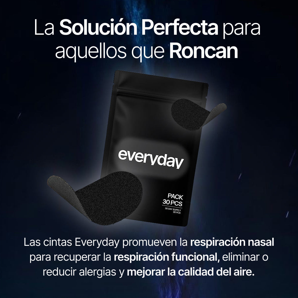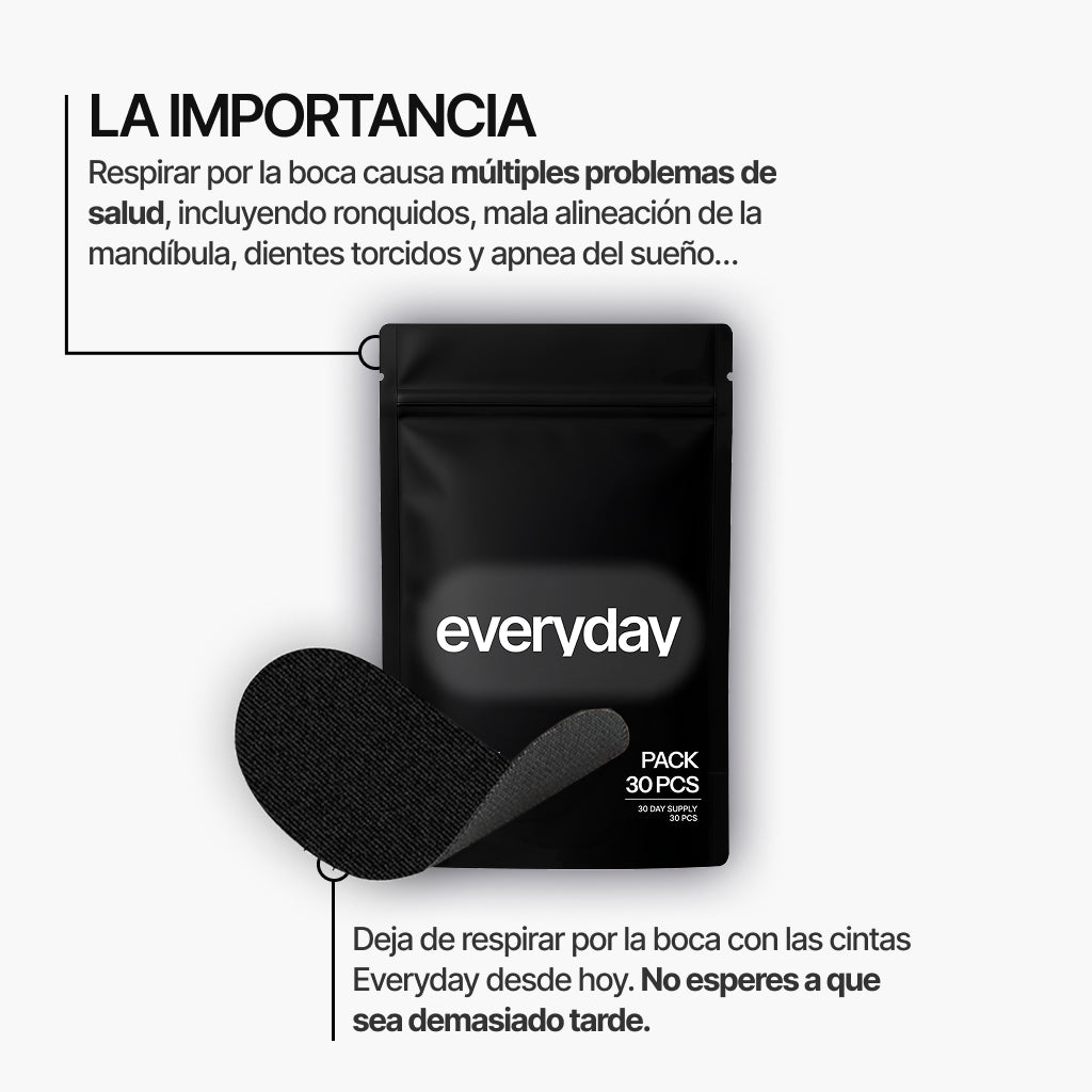Mientras que la Cinta Bucal Everyday® es generalmente segura. No es recomendable usar si tienes dificultad para respirar por la nariz al estar muy resfriado, tener sinusitis, infección de oído o congestión nasal severa. No la utilices si padeces apnea del sueño y no usas un dispositivo CPAP, si eres obeso (IMC superior a 35), si tienes la presión arterial muy baja o sufres problemas cardíacos o respiratorios graves. Tampoco se recomienda su uso si has consumido alcohol o sedantes antes de dormir, ni si tienes los labios muy agrietados o la piel irritada en la zona de aplicación.
