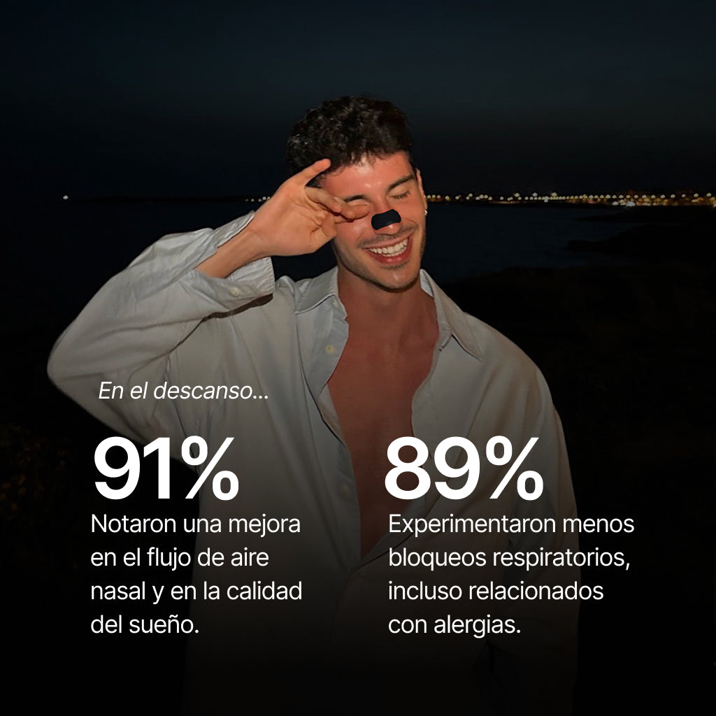 Este pack combina nuestras tiras nasales y la mouth tape para que disfrutes de una respiración óptima tanto de día como de noche. Las tiras nasales abren suavemente las vías respiratorias, facilitando la entrada de aire y mejorando el flujo de oxígeno durante el deporte, la actividad diaria o en momentos de congestión. Por la noche, la mouth tape fomenta la respiración nasal, reduce los ronquidos y ayuda a evitar la sequedad en la boca, favoreciendo un sueño más profundo y reparador.